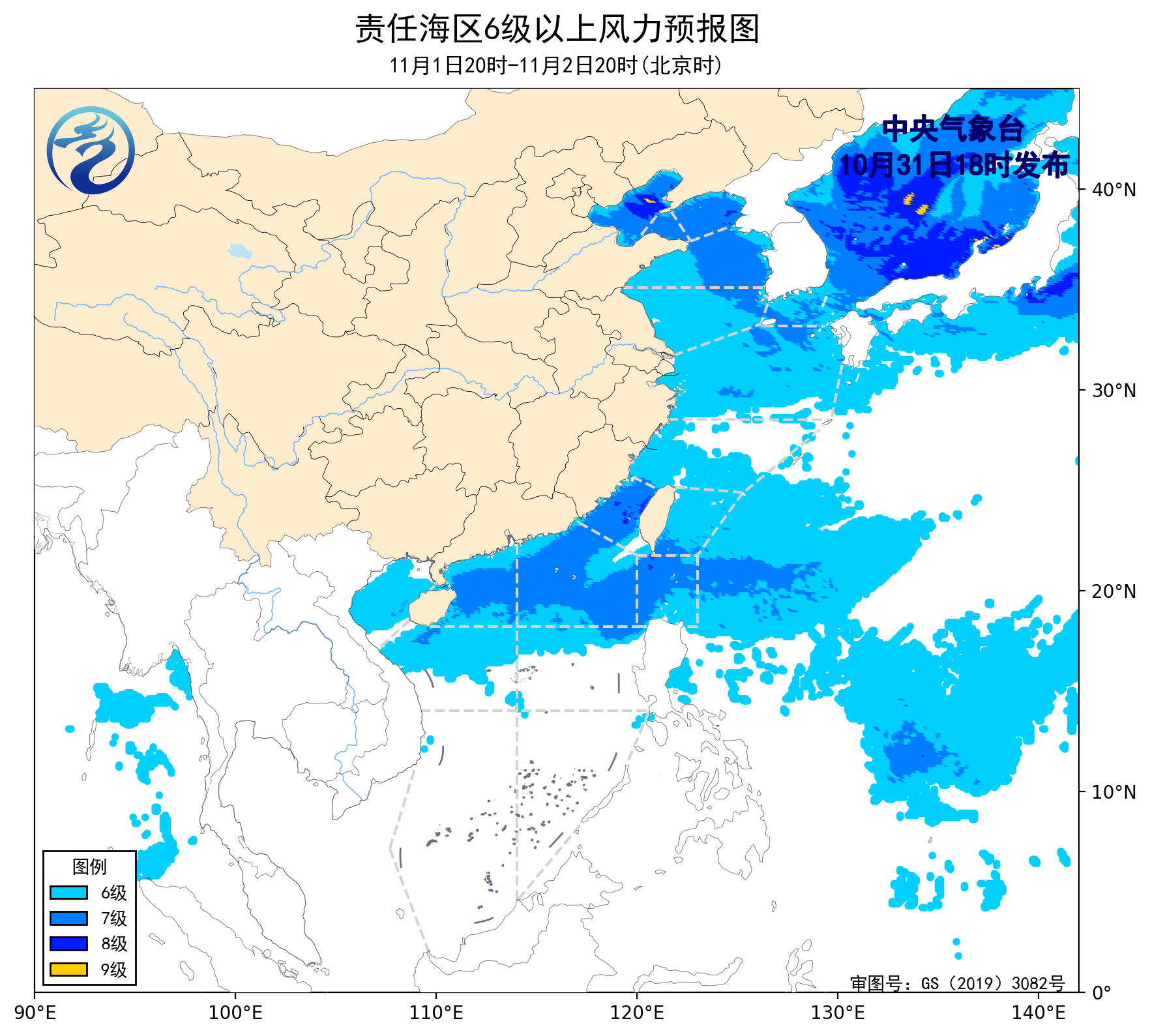 10月31日20时至11月1日20时,渤海将有4~5级的西北风增大到7~8级、阵风9级的偏北风,黄海北部海域将有4~5级的偏西风增大到6~7级、阵风8级的西北风,台湾海峡、巴士海峡将有5~7级、阵风8级的东北风,渤海海峡、黄海中部和南部海域、东海北部海域将有5~6级、阵风7级的偏北到西北风,东海南部海域、台湾以东洋面、北部湾、南海北部和中部海域将有5~6级、阵风7级的偏北到东北风,琼州海峡将有5~6级、阵风7级的东北风到偏东风。