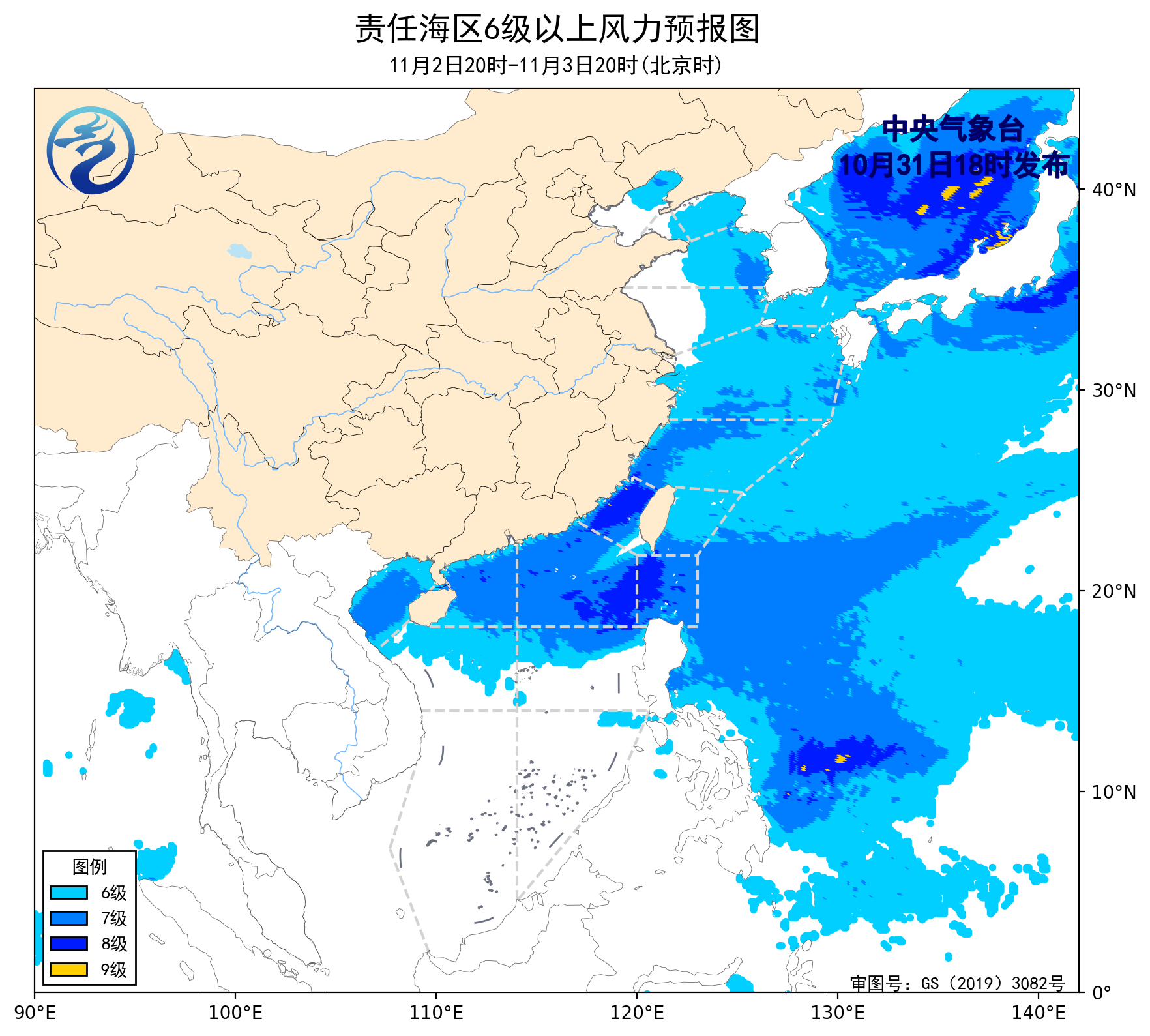 预计,11月3日夜间至11月6日夜间,渤海、黄海大部海域、琼州海峡将有6~7级、阵风8级的风,渤海海峡将有5~6级、阵风7级的风,东海大部海域、北部湾将有6~8级、阵风9级的大风,台湾海峡将有8~9级、阵风10级的大风,台湾以东洋面、巴士海峡将有7~8级、阵风9级的大风,南海大部海域将有6~7级、阵风8级增大至9~10级、阵风11级的大风。